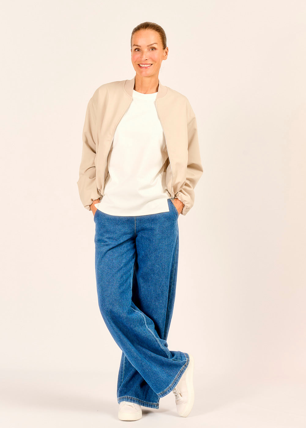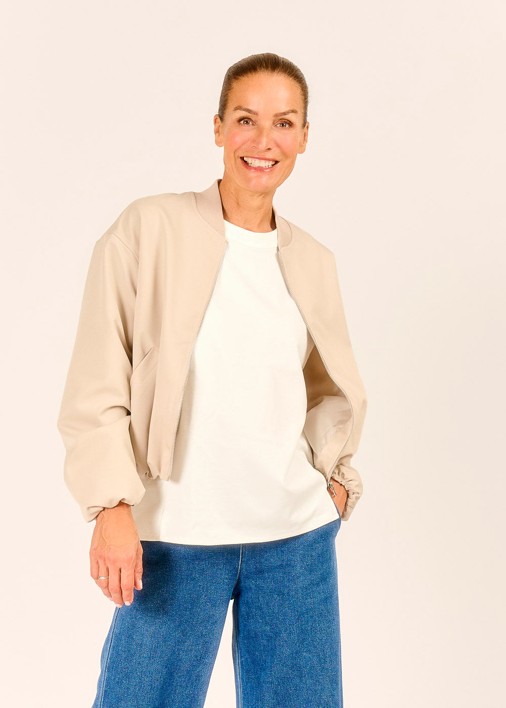 Lässig, leicht, luxuriös – dieser Bomberino in softem Beige verleiht jedem Outfit mühelos Stil. Die kurze, moderne Silhouette trifft auf sportliche Details wie den elastischen Saum und die lockeren Ärmelabschlüsse. Ein echtes Allround-Talent für den Übergang, das Minimalismus mit urbaner Coolness verbindet.